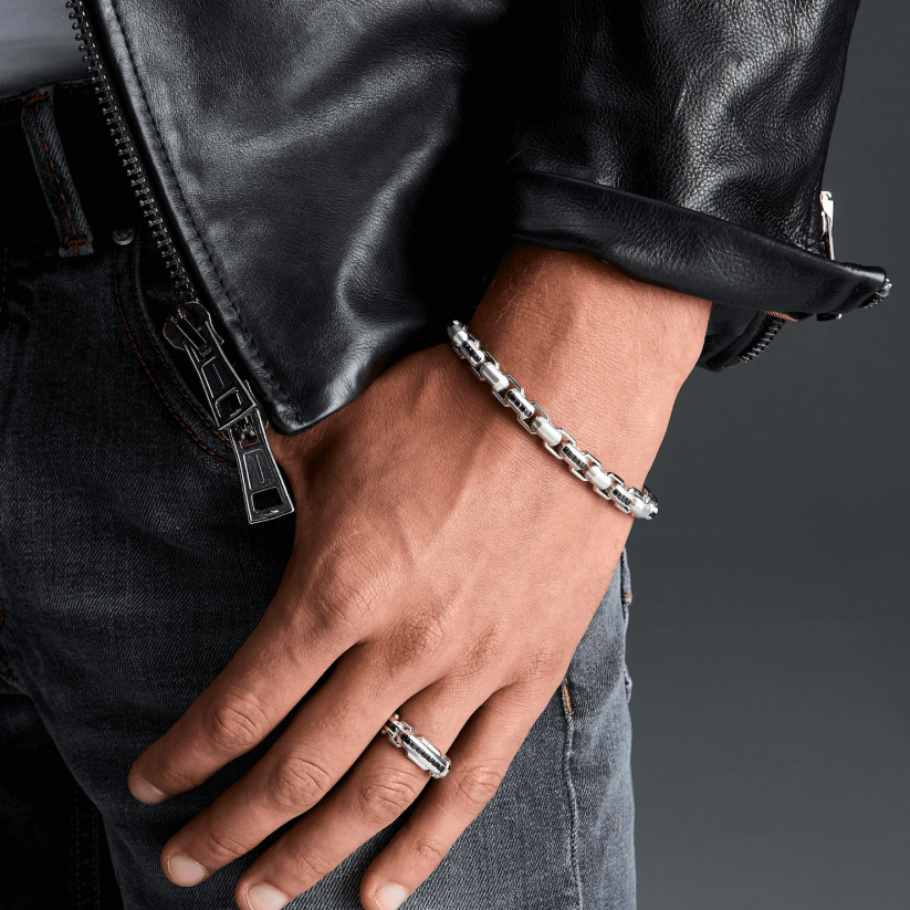 Zancan soft link bracelet made from 925 silver. The bracelet is composed of intersected geometric link studded with natural black spinels on top. A bracelet with a refined, sophisticated style, embellished by fine details. The snap closure bears the Zancan logo. The piece is part of the Cosmopolitan Luxury collection, i.e. the premium division of our general Cosmopolitan collection, inspired by international metropolitan design. The piece is completely crafted by hand in Italy and weighs 47.60 g.