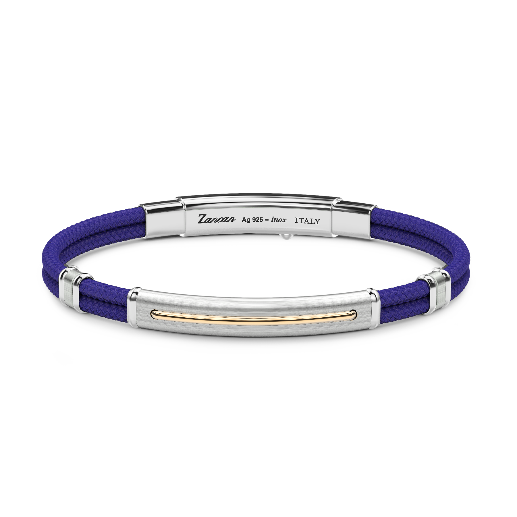 Zancan bracelet in Kevlar rope with silver plate. On the plate is placed a silver rudder with yellow gold treatment. The Kevlar rope, very resistant and unalterable material, used in nautical competitions. The bracelet is part of the Regatta collection, inspired by the nautical world and with a strong summery feel. The stainless steel closure is adjustable in three different sizes. The jewel is completely handmade in Italy and has a weight of 1.70gr.