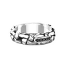 Silver ring with interwoven relief and small tag enclosing five central black stones. Peculiar and unusual, with a clear, elegant, central detail, free of all standards, it emphasizes your individuality in all situations. Silver and black spinel ring. The ring is made from 925 silver and weighs 8.30 g. Glossy rhodium-plating treatment. Starting at size 18.