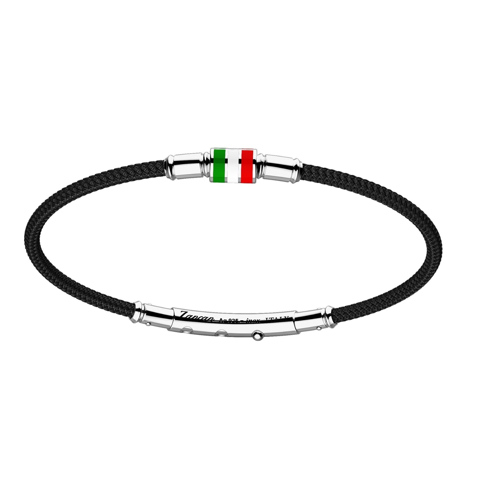 Zancan silicone bracelet with lacquered italian flag. The bracelet has a silicone structure, very robust, durable nautical rope, available in various color options. The front of the bracelet features a silver cylindrical element where a italian flag is hot-lacquered. Each flag has a meaning. A colorful, lively, summery and spontaneous bracelet.