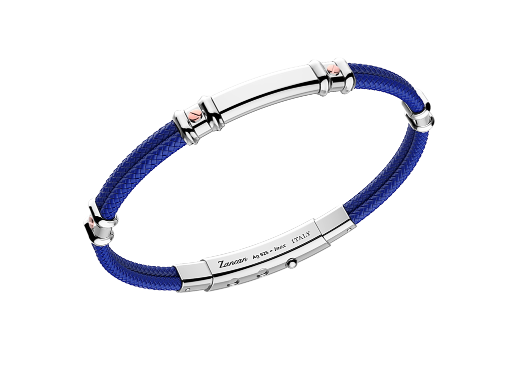 Bracelet en silicone bleu avec étiquette en argent et détails en or rose