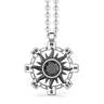 Collier en argent Zancan. Ce pendentif en forme de soleil est orné d'une onyx noire sertie au centre. Son pourtour extérieur contient les points cardinaux. La coloration noire de l'argent est obtenue grâce à un traitement de rhodiage noir. La pièce fait partie de la collection Cosmostone, caractérisée par des pierres naturelles étincelantes. Le collier est entièrement réalisé à la main en Italie, pèse 10,50 g et a une longueur standard de 50 cm. Le pendentif mesure 26 x 22 mm.