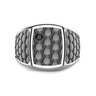 Bague en argent 925 de Zancan. Une texture géométrique en relief parcourt toute la surface de la bague dans une couleur noire contrastante. Elle est en outre embellie par un spinelle noir serti sur le dessus. Sa coloration particulière est obtenue par un processus de brunissage. La pièce fait partie de la collection Cosmopolitan, inspirée de la vie urbaine contemporaine au rythme effréné. La pièce est entièrement réalisée à la main en Italie et pèse 8,30 g.